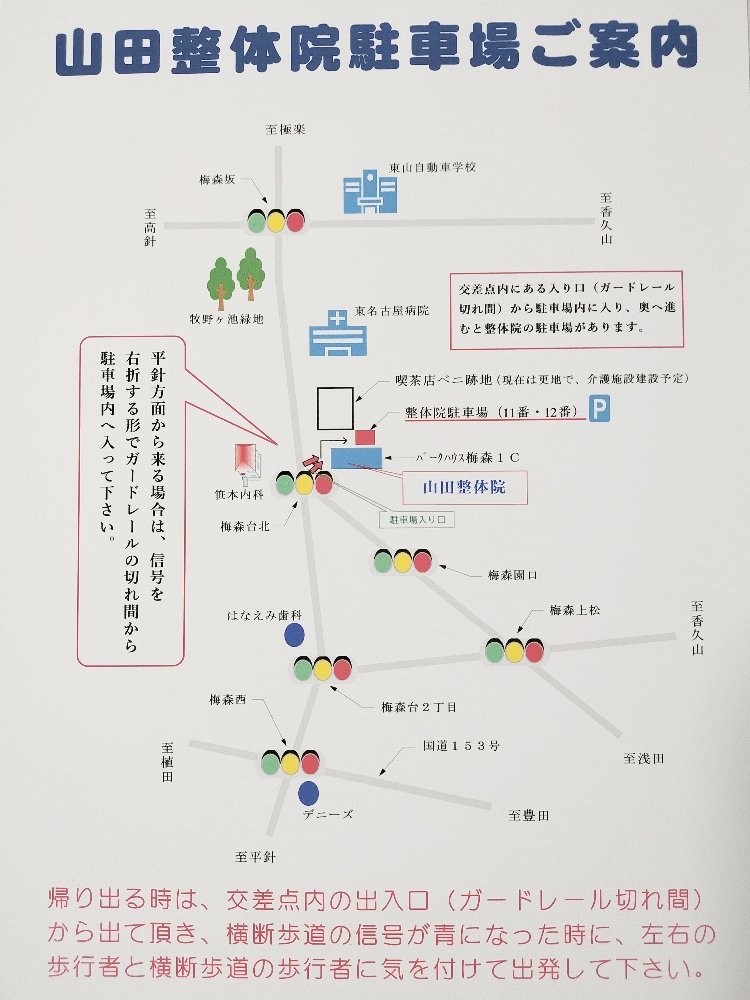 駐車場に入っていただき、そのまま奥へ進んで行くと山田整体院専用駐車場(11番、12番)があります。駐車場にバックでお車を止めていただくと、そこからそのまま歩いて前進した所に当院のあるマンション(パークハウス梅森)の入り口があります。 ※当院は1階のC号室になります。(看板が出ています)